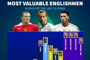 体育资讯1月24日讯 德转盘点了近15年中,每一年身价最高的英格兰球员,其中近五年身价最高均为贝林厄姆,具体如下: